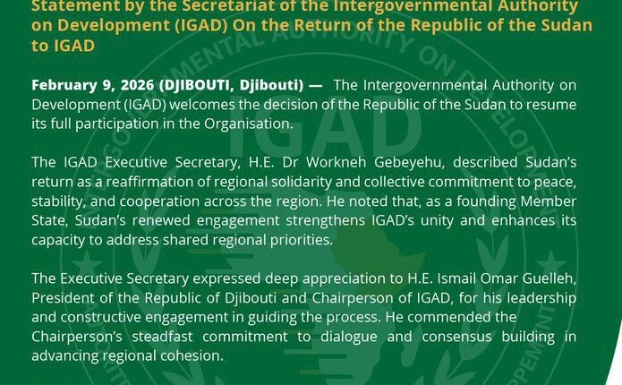 The Intergovernmental Authority on Development (IGAD) has welcomed Sudan’s decision to resume its full participation in the organization.