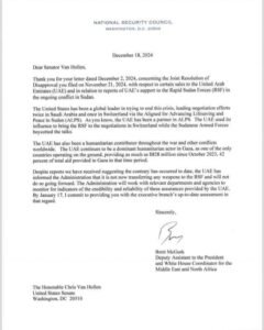 This announcement follows a letter submitted by Senator Chris Van Hollen to President Biden’s office on November 21, 2024, regarding U.S. arms sales to the UAE and its alleged role in supplying weapons to the RSF in Sudan.